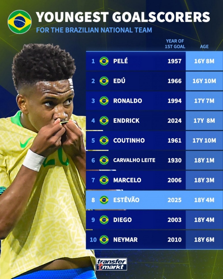 9月5日,巴西队在世预赛中以3-0击败智利,小将埃斯特旺斩获个人国家队首球。《转会市场》随即公布了巴西队史最年轻进球者排名,埃斯特旺位列第八。