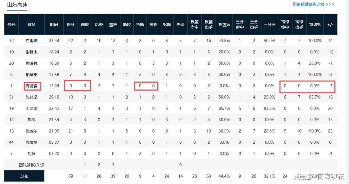 同样是后卫,与于德豪相比,拿着顶薪600万的高诗岩就差多了,他继续着他打铁的风采和特点,全场毫无手感,2投0中,一分不得。交出惨淡的数据:0分0抢断,甚至0罚球,正负值是负。更令高诗岩尴尬的是,因为于德豪打得好,主教练邱彪弃用了高诗岩,仅让他打了13分钟,比于德豪少打了9分钟。上一场高诗岩轮休,山东队也战胜了北京队。山东队赢球有一条规律,那就是高诗岩不上场或是少上场山东队赢球的概率就大,反之赢球的概率就小。