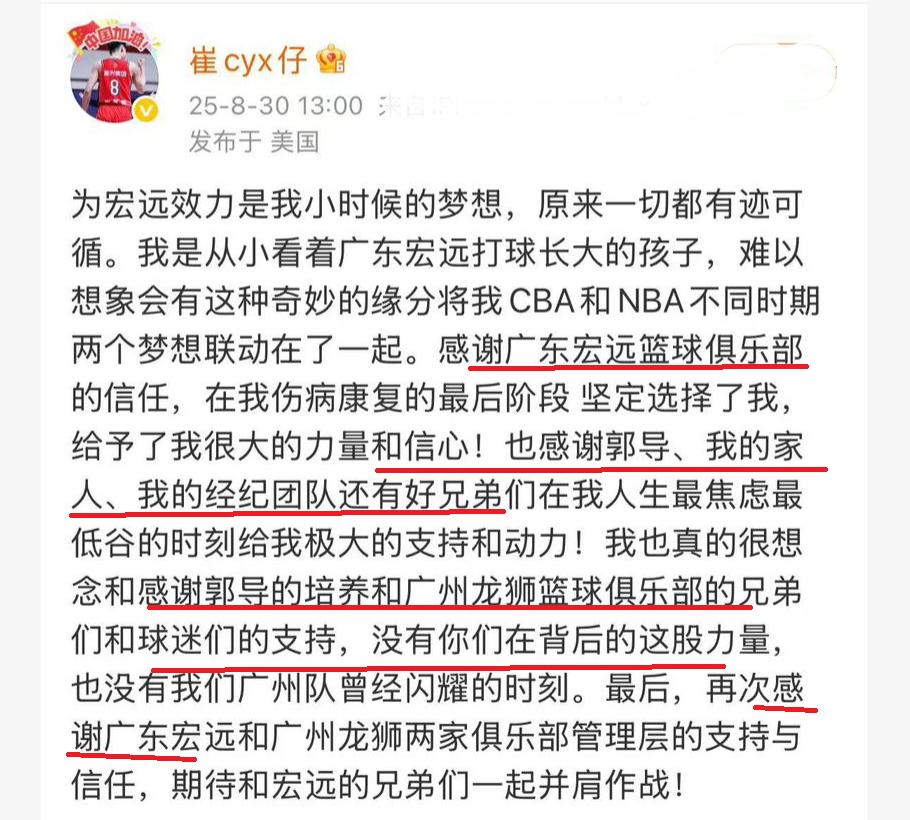 崔永熙表示,正是在郭士强教练的悉心指导下,自己才得以不断成长,广州龙狮篮球俱乐部的兄弟们以及球迷们的支持,也为他的篮球之路注入了源源不断的能量,“没有你们在背后的这股力量,也没有我们广州队曾经闪耀的时刻”。此外,他还向自己的家人、经纪团队以及好兄弟们表达了谢意,感谢他们一直以来的陪伴与鼓励。