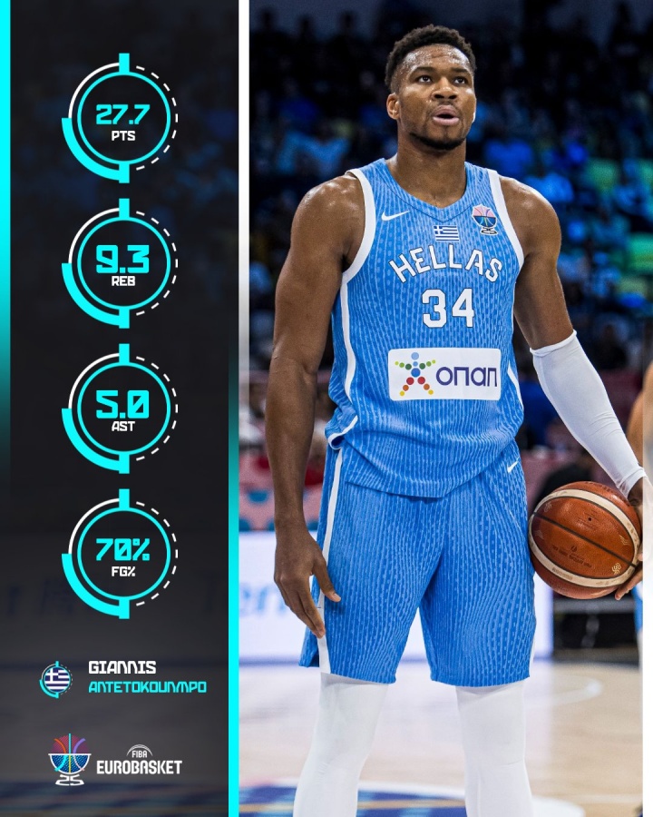 今年欧锦赛至今,字母哥出战3场比赛,效率非常变态,他场均上阵28.7分钟可以砍下27.7分9.7篮板5助攻1抢断,投篮命中率是69.6%,三分命中率为100%(1中1),罚球命中率是62.1%,场均正负值+18,场均效率值为32.3%。